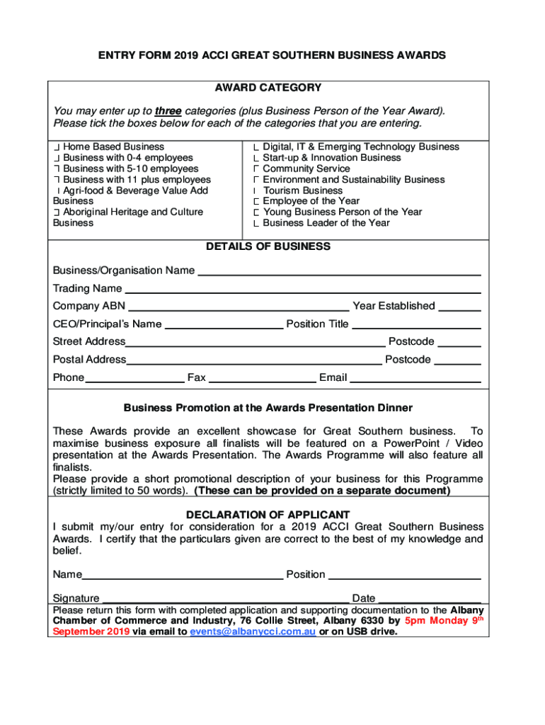 ALBANY CHAMBER OF COMMERCE & INDUSTRYGreat Southern2019BUSINESSAWARDSProudly Presented Application PackProudly Sponsored by:ENTRY INFORMATION Welcome to the 2019 CCI Great Southern Business Awards.