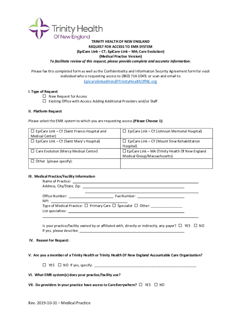 TRINITY HEALTH OF NEW ENGLAND REQUEST FOR ACCESS TO EMR SYSTEM (Epicure Link CT; Epicure Link MA; Care Evolution) (Medical Practice Version) To facilitate review of this request, please provide complete