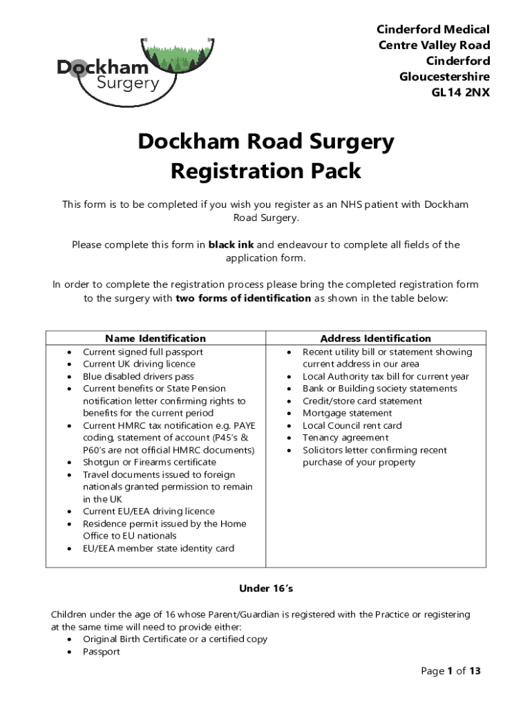 Cinder ford Medical Center Valley Road Cinder ford Gloucestershire GL14 2NXDockham Road Surgery Registration Pack This form is to be completed if you wish you register as an NHS patient with Dock