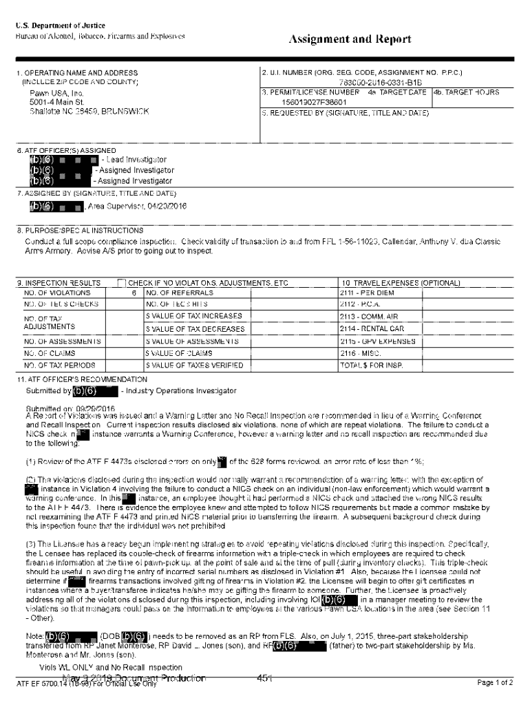 U.S. Department of Justice Bureau of Alcohol, Tobacco, Firearms and ExplosivesAssignment and Report 2. U.I. NUMBER (ORG. SEG. CODE, ASSIGNMENT NO., P.P.C.) 76305020160331B1B 3. PERMIT/LICENSE NUMBER