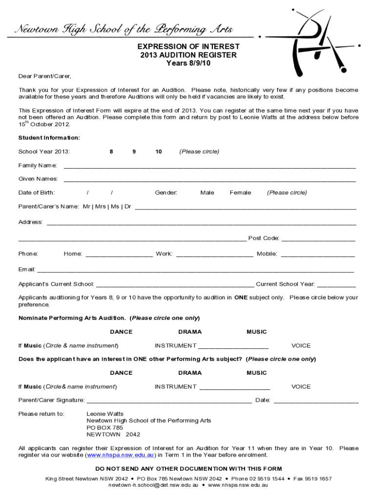 EXPRESSION OF INTEREST 2013 AUDITION REGISTER Years 8/9/10 Dear Parent/Carer, Thank you for your Expression of Interest for an Audition. Please note, historically very few if any positions become