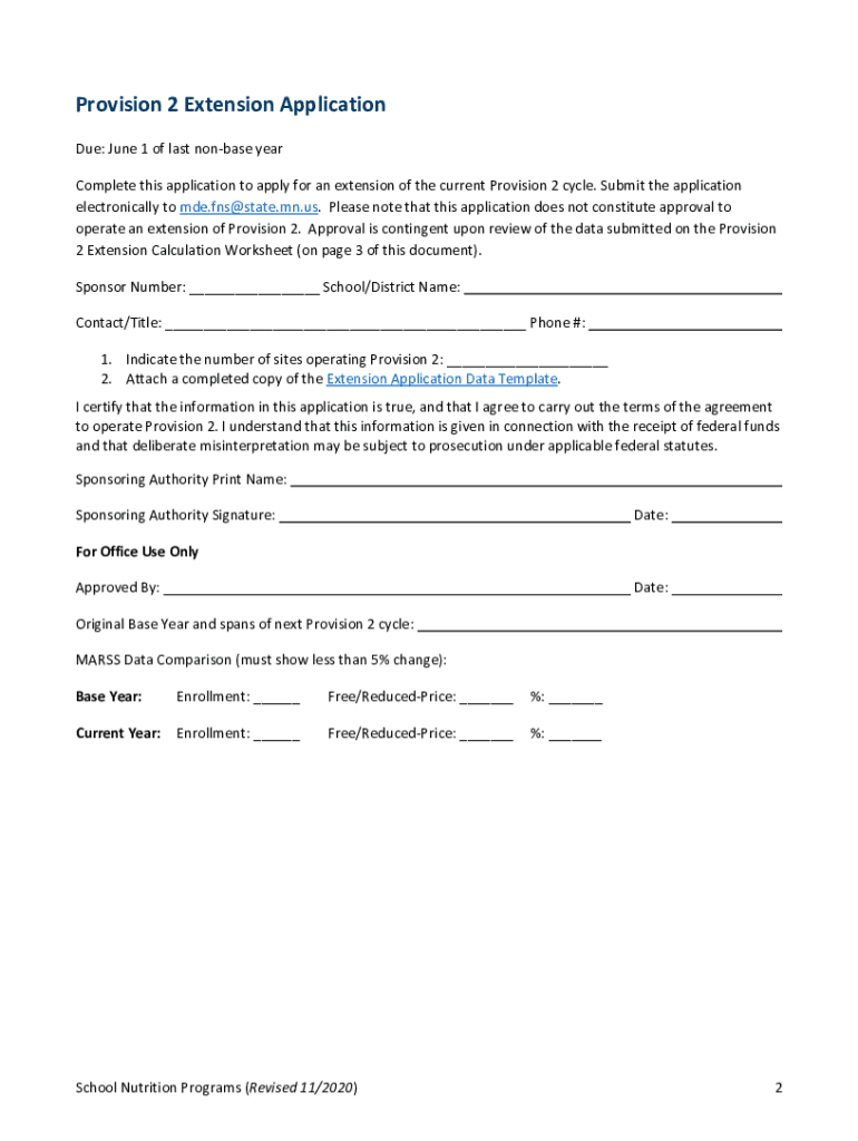 School Nutrition Programs Applying for a Provision 2 Extension Instructions At the end of the Fourier provision 2 cycles, schools may request from the Minnesota Department of Education (MDE) Nutrition,