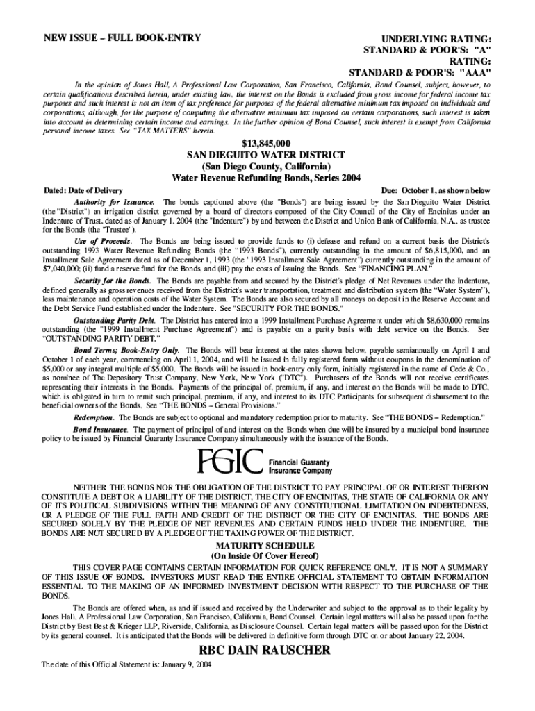 NEW ISSUE FULL BOOKENTRYUNDERLYING RATING: STANDARD & POOR\'S: \” A\” RATING: STANDARD & POOR\'S: \” AAA\” In the opinion of Jones Hall, A Professional Law Corporation, San Francisco, California,