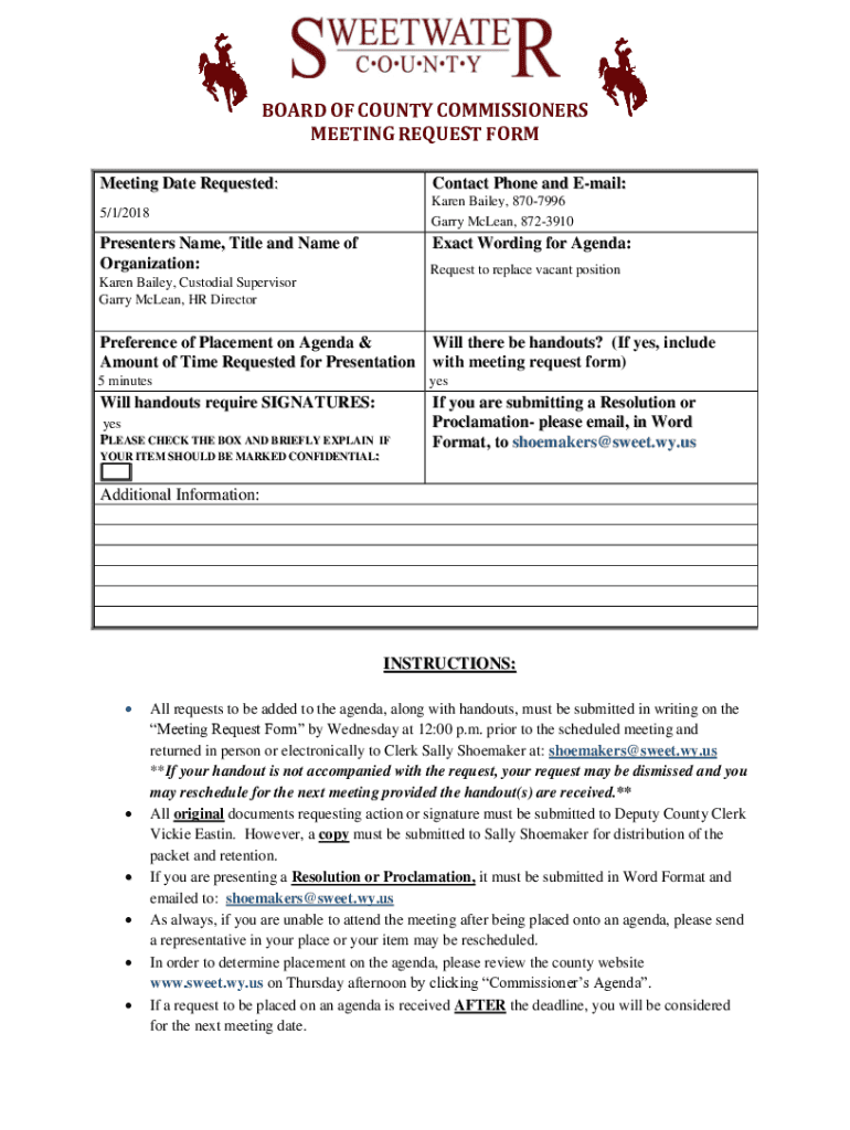 NOTICE THESWEETWATERCOUNTYBOARDOFCOUNTYCOMMISSIONERS WILLMEETONTUESDAYMay1,2018AT8:30A. M. INTHECOMMISSIONERS\'CHAMBERS (TENTATIVEANDSUBJECTTOCHANGE) PLEASEARRIVE15MINUTESEARLIERTHANYOURSCHEDULEDTIMEPRELIMINARY