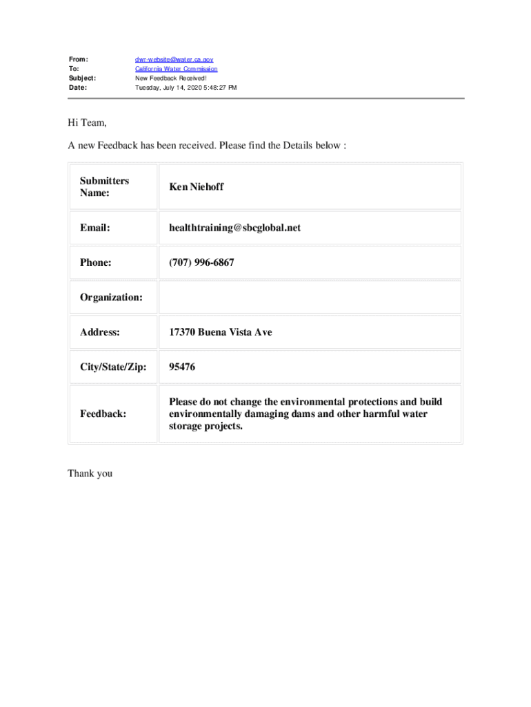 From: To: Subject: Date:website×water.ca.gov California Water Commission New Feedback Received! Tuesday, July 14, 2020 5:48:27 PMI Team, A new Feedback has been received. Please find the Details