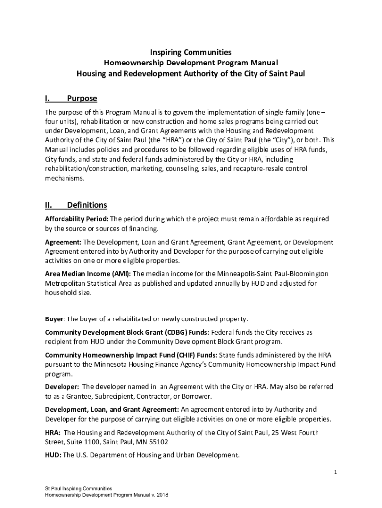 Inspiring Communities Homeownership Development Program Manual Housing and Redevelopment Authority of the City of Saint Paul I. Purpose of this Program Manual is to govern the implementation of single