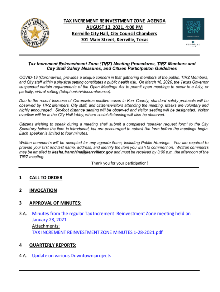TAX INCREMENT REINVESTMENT ZONE AGENDA AUGUST 12, 2021, 4:00 PM Kerrville City Hall, City Council Chambers 701 Main Street, Kerrville, Texas Increment Reinvestment Zone (TIRE) Meeting Procedures,