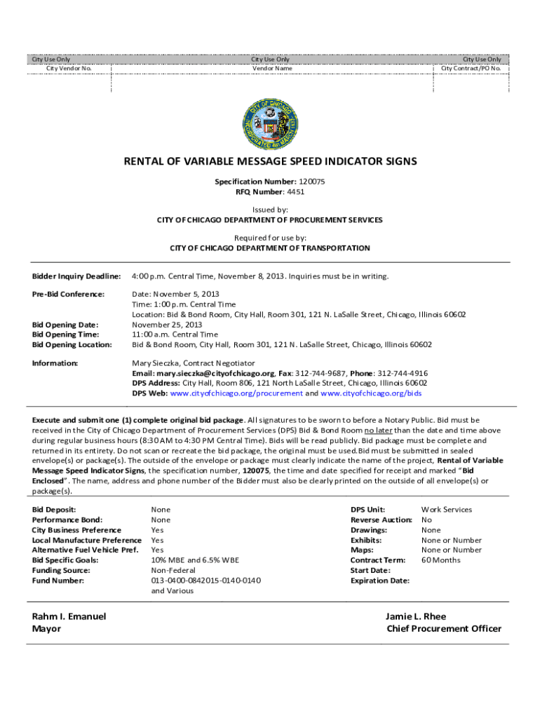 City Use Only City Vendor No. City Use Only Vendor Amenity Use Only City Contract/PO No. RENTAL OF VARIABLE MESSAGE SPEED INDICATOR SIGNS Specification Number: 120075 RFQ Number: 4451 Issued by: CITY