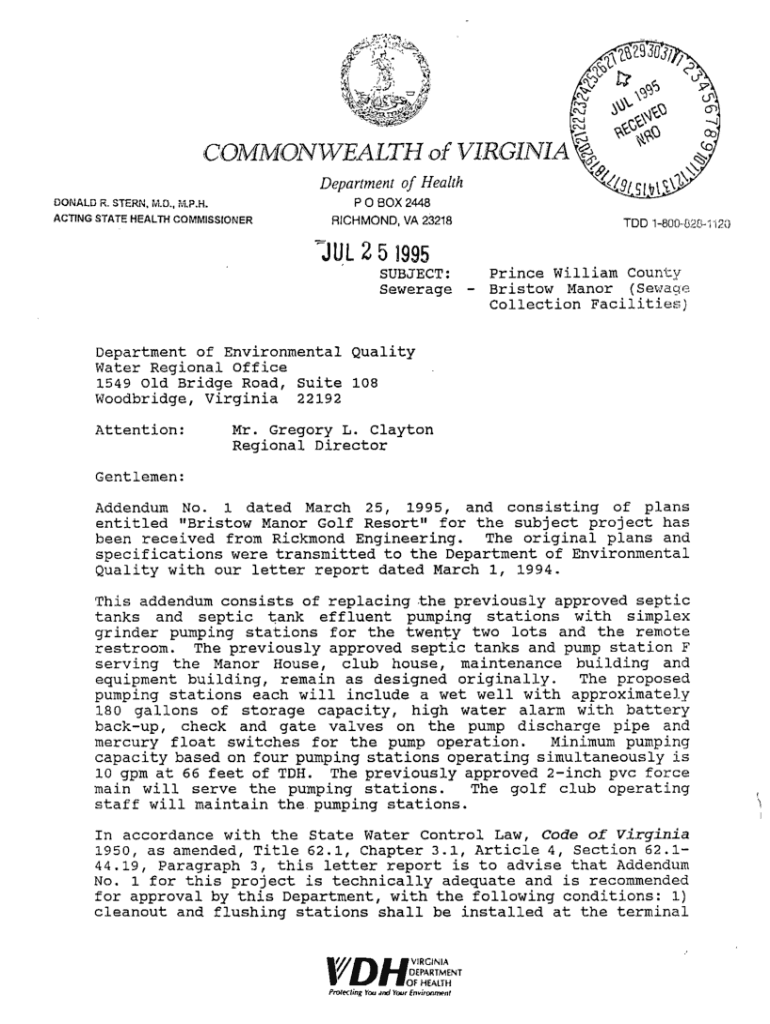 CRJ JJ CD/ O/department of Health DONALD R. STERN. M.D., M.P.H.ACTING STATE HEALTH COMMISSIONER O BOX 2448 RICHMOND, VA 23218TDD 18004)281120JUL 2 5 1995 SUBJECT: Sewerage Prince William County Bristol