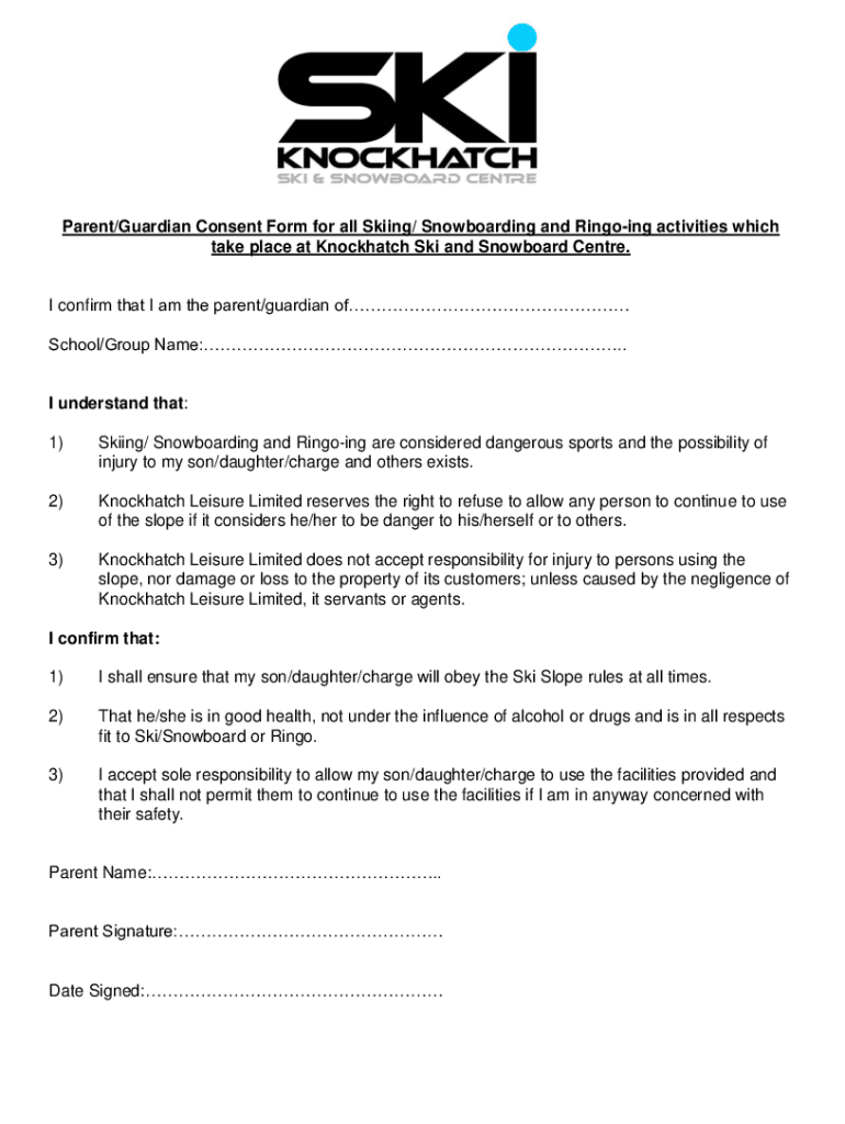 Parent/Guardian Consent Form for all Skiing/ Snowboarding and Ringing activities which take place at Knock hatch Ski and Snowboard Center. I confirm that I am the parent/guardian of School/Group Name:.