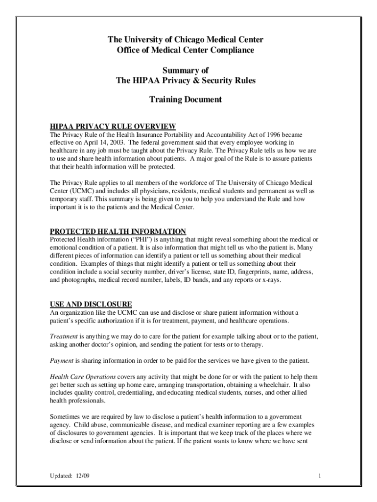 The University of Chicago Medical Center Office of Medical Center Compliance Summary of The HIPAA Privacy & Security Rules Training Document HIPAA PRIVACY RULE OVERVIEW The Privacy Rule of the Health