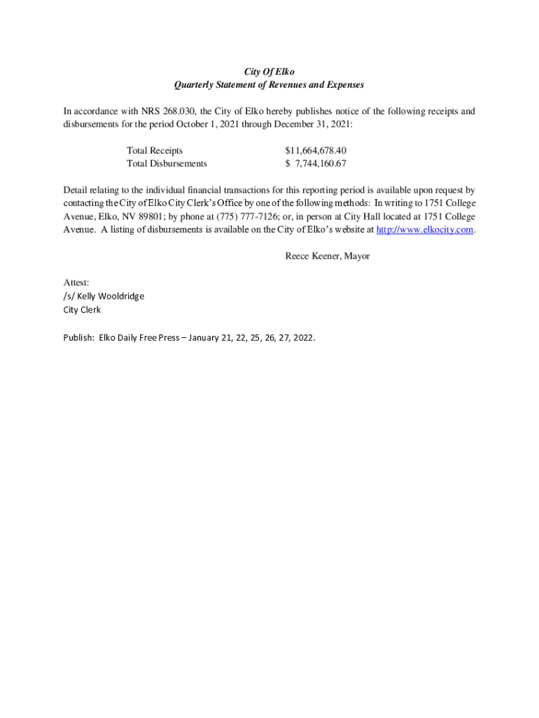 City Of Elk Quarterly Statement of Revenues and Expenses In accordance with NRS 268.030, the City of Elk hereby publishes notice of the following receipts and disbursements for the period October