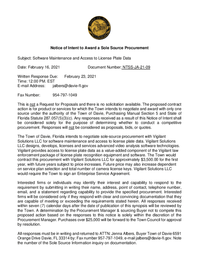 Get the free Notice of Intent to Award a Sole Source ... - Davie, FL