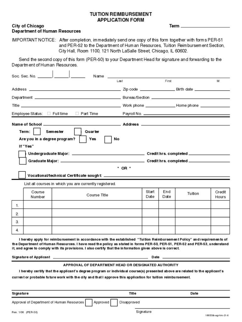 TUITION REIMBURSEMENT APPLICATION FORM City of Chicago Department of Human ResourcesTermIMPORTANT NOTICE: After completion, immediately send one copy of this form together with forms PER51 and PER52