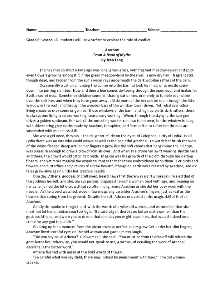 Name: ___ Teacher: ___ School: ___ Grade 6: Lesson 13 Students will use Arachne to explore the role of conflict. Arachne From A Book of Myths By Jean Lang The hay that so short a time ago was long,