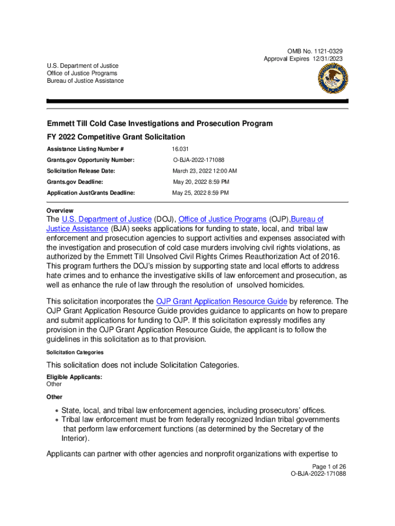 OMB No.11210329 Approval Expires 12/31/2023 U.S. Department of Justice Office of Justice Programs Bureau of Justice Assistance Emmett Till Cold Case Investigations and Prosecution Program FY 2022