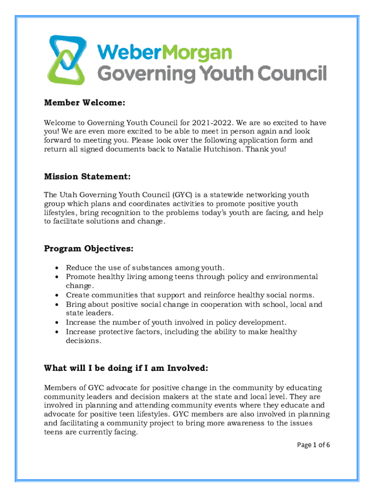 Member Welcome: Welcome to Governing Youth Council for 20212022. We are so excited to have you! We are even more excited to be able to meet in person again and look forward to meeting you. Please