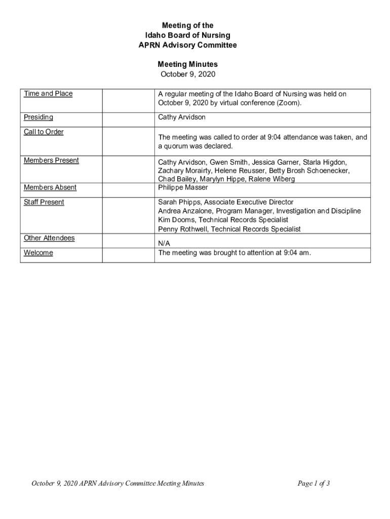 Meeting of the Idaho Board of Nursing APRN Advisory Committee Meeting Minutes October 9, 2020, Time and Place regular meeting of the Idaho Board of Nursing was held on October 9, 2020, by virtual