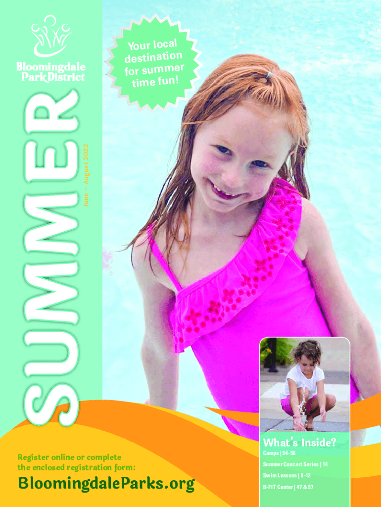 June August 2022SUMMERYour local destination for summer fun! What's Inside? Register online or complete the enclosed registration form:Bloomingdale Parks. Camps | 5456Summer Concert Series | 14 Swim