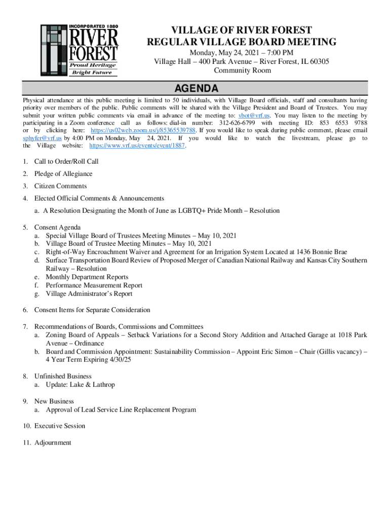 VILLAGE OF RIVER FOREST REGULAR VILLAGE BOARD MEETING Monday, May 24, 2021 7:00 PM Village Hall 400 Park Avenue River Forest, IL 60305 Community Romagna Physical attendance at this public meeting