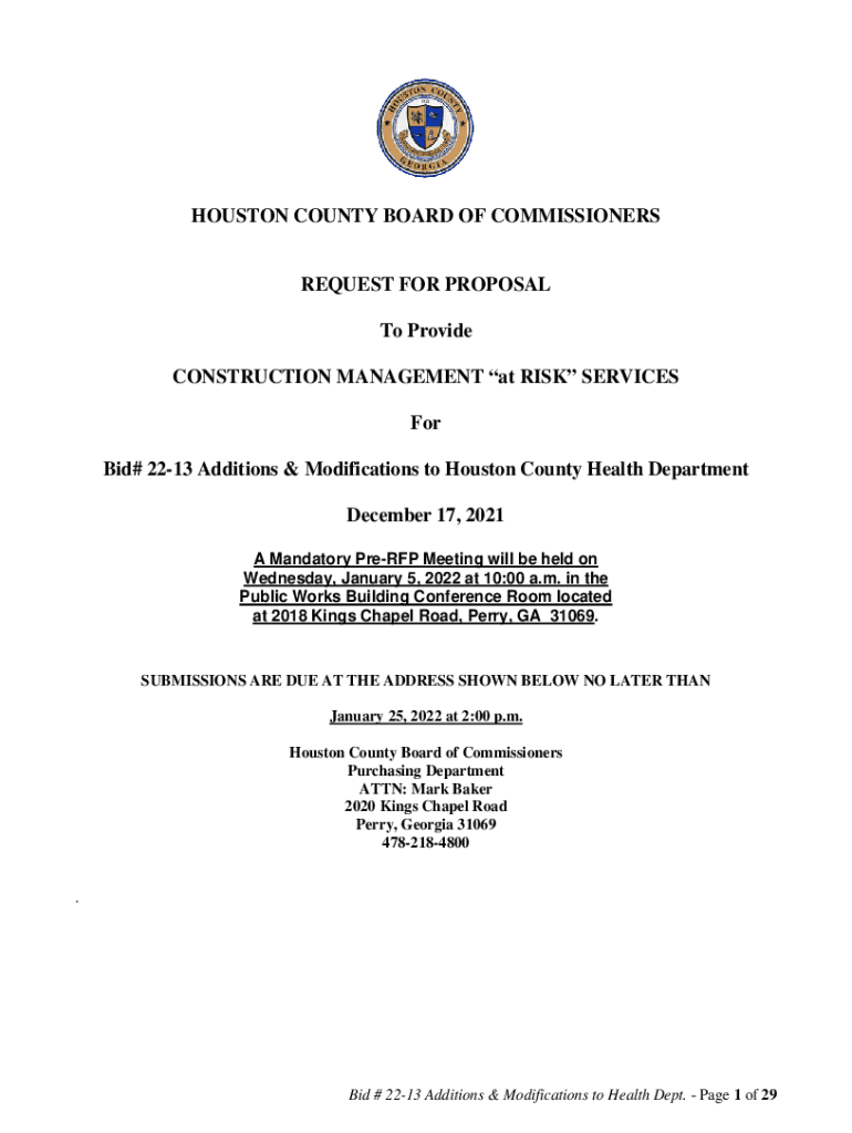 HOUSTON COUNTY BOARD OF COMMISSIONERSREQUEST FOR PROPOSAL To Provide CONSTRUCTION MANAGEMENT at RISK SERVICES For Bid# 2213 Additions & Modifications to Houston County Health Department December 17,