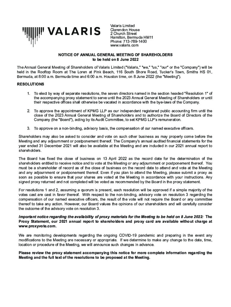 Valarie Limited Clarendon House 2 Church Street Hamilton, Bermuda HM11 Phone: 7137891400 www.valaris.com NOTICE OF ANNUAL GENERAL MEETING OF SHAREHOLDERS to be held on 8 June 2022 The Annual General