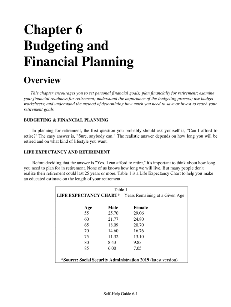 Chapter 6 Budgeting and Financial Planning Overview This chapter encourages you to set personal financial goals; plan financially for retirement; examine your financial readiness for retirement; understand