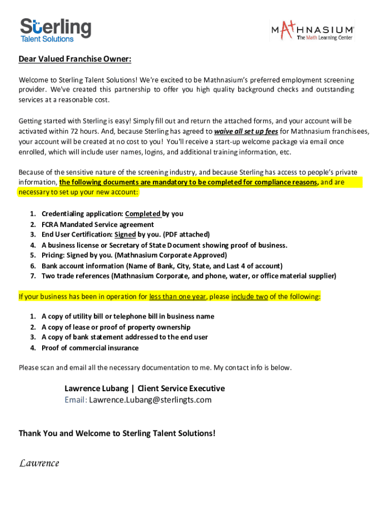 Dear Valued Franchise Owner: Welcome to Sterling Talent Solutions! We\'re excited to be Athanasius preferred employment screening provider. We\'ve created this partnership to offer you high quality