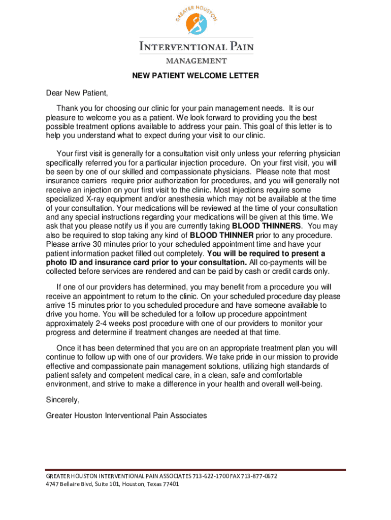 NEW PATIENT WELCOME LETTER Dear New Patient, Thank you for choosing our clinic for your pain management needs. It is our pleasure to welcome you as a patient. We look forward to providing you the
