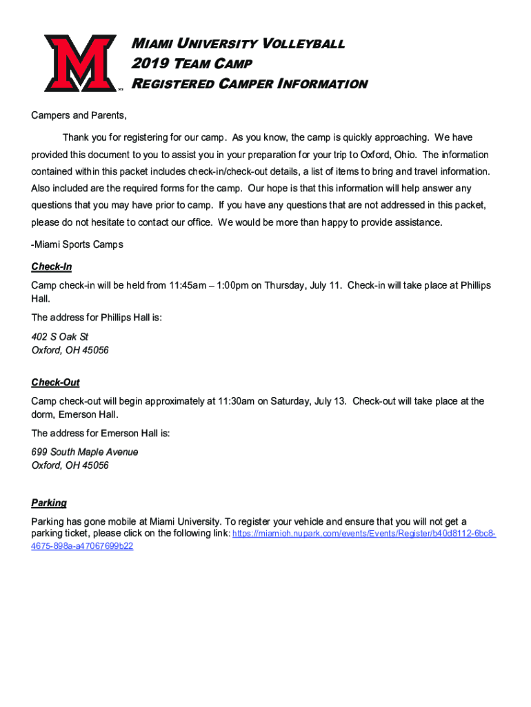 MIAMI UNIVERSITY VOLLEYBALL 2019 TEAM CAMP REGISTERED CAMPER INFORMATION Campers and Parents, Thank you for registering for our camp. As you know, the camp is quickly approaching. We have provided