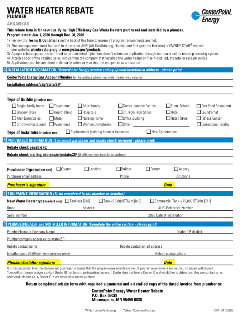 WATER HEATER REBATE PLUMBER ARKANSASThis rebate form is for new qualifying High Efficiency Gas Water Heaters purchased and installed by a plumber. Program dates: Jan. 1, 2020 through Dec. 31, 2020