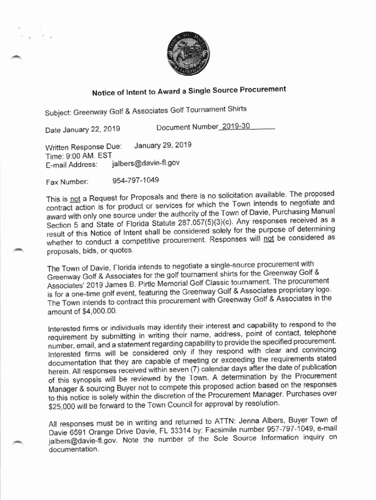 Get the free Notice of Intent to Award a Single Source Procurement ...
