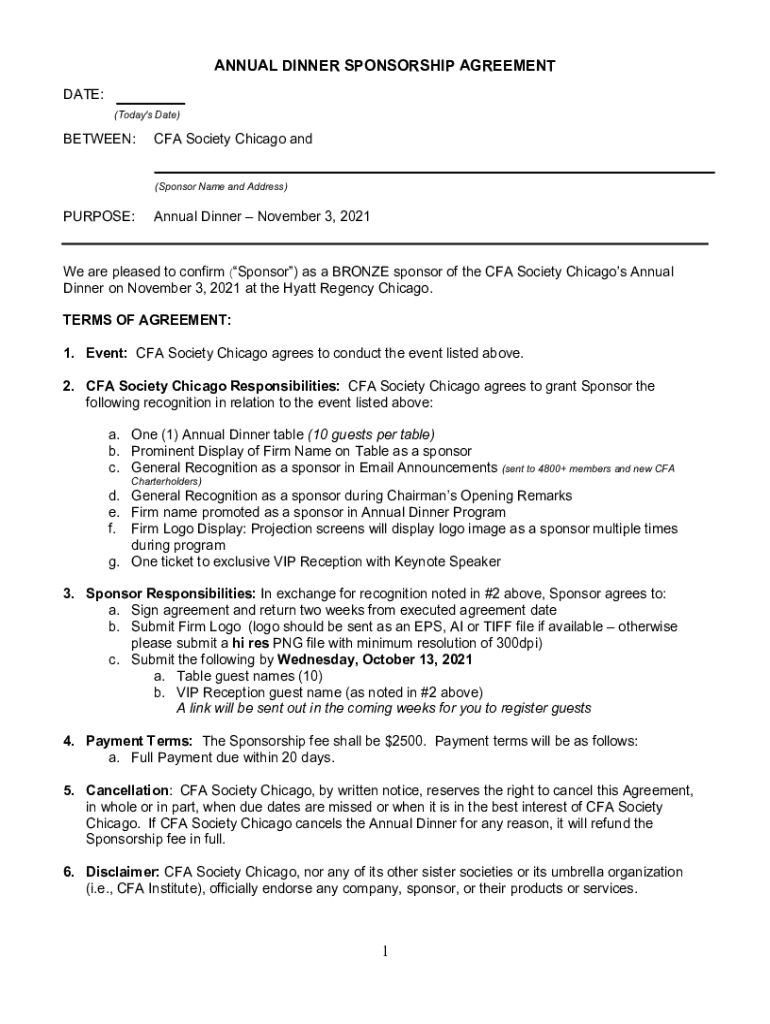 ANNUAL DINNER SPONSORSHIP AGREEMENT DATE: (Today\'s Date)BETWEEN:CFA Society Chicago and (Sponsor Name and Address)PURPOSE:Annual Dinner November 3, 2021We are pleased to confirm (Sponsor) as a BRONZE