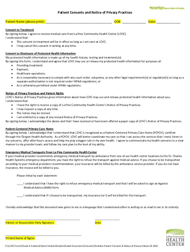 PEDIATRIC New Patient PacketPatient Consents and Notice of Privacy Practices Patient Name (please print): ___ DOB: ___ Date: ___ Consent to Treatment By signing below, I agree to receive medical care
