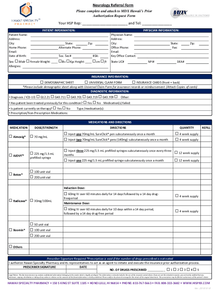 Neurology Referral Form Please complete and attach to MDX Hawaii's Prior Authorization Request Former HSP Rep: ___ and Tel: ___ Patient Name: Address: City: Home Phone: Email: Date of Birth:PATIENT