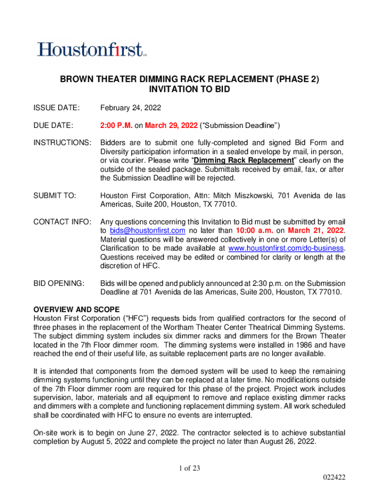 BROWN THEATER DIMMING RACK REPLACEMENT (PHASE 2) INVITATION TO BID ISSUE DATE:February 24, 2022DUE DATE:2:00 P.M. on March 29, 2022 (Submission Deadline)INSTRUCTIONS:Bidders are to submit one fully