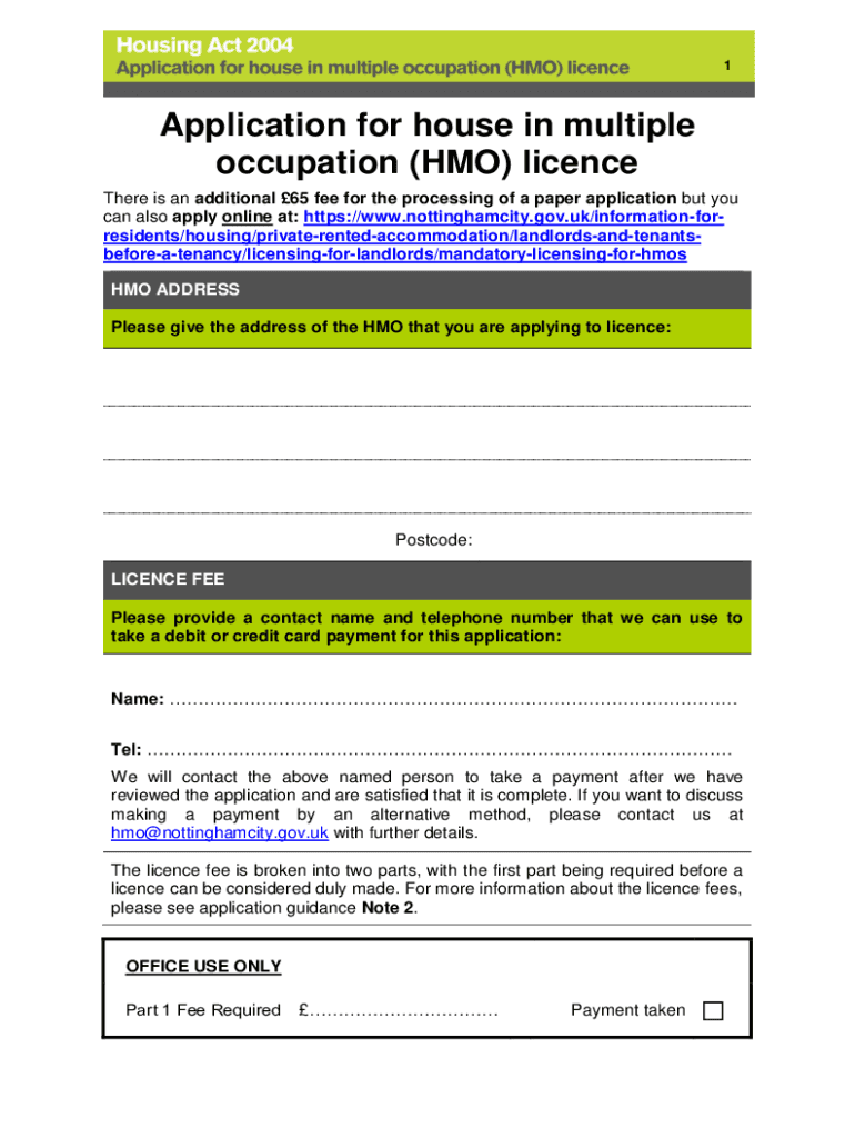 1Application for house in multiple occupation (HMO) license There is an additional 65 fee for the processing of a paper application, but you can also apply online at: https://www.nottinghamcity.gov.uk/informationforresidents/housing/privaterentedaccommodation/landlordsandtenantsbeforeatenancy/licensingforlandlords/mandatorylicensingforhmos