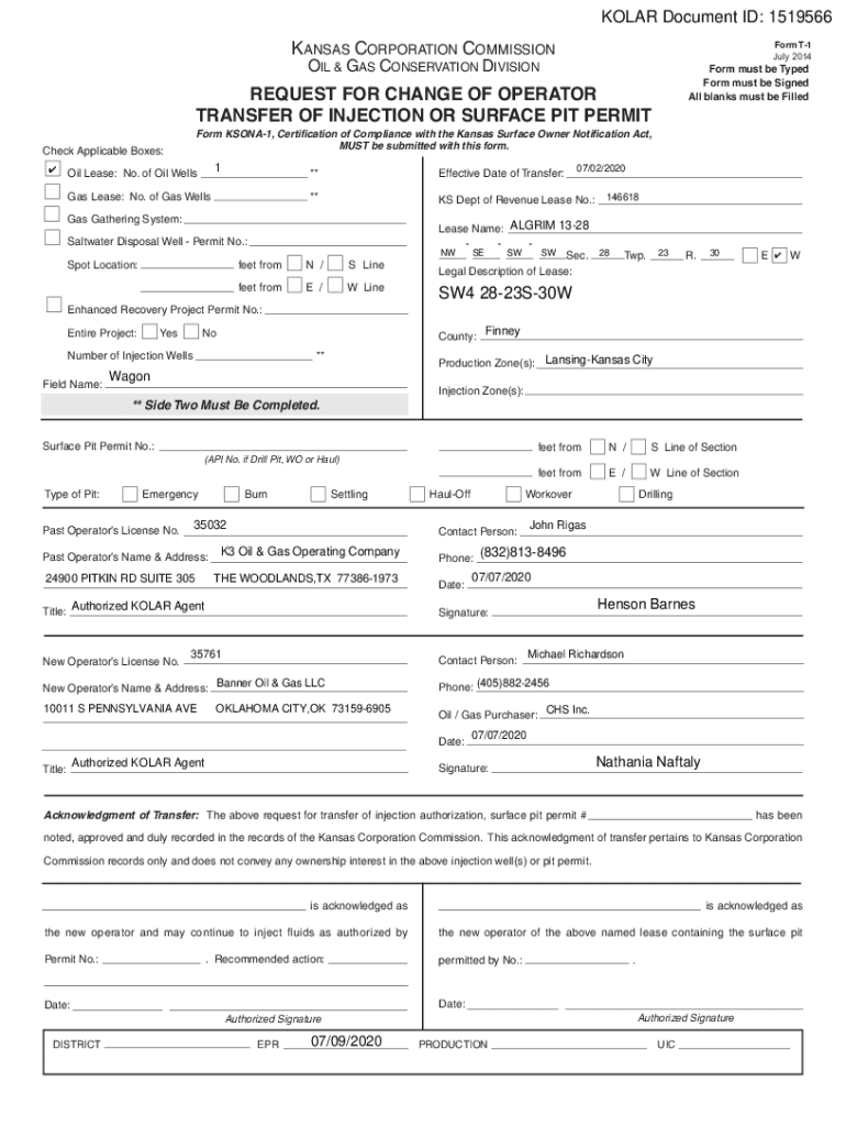 SOLAR Document ID: 1519566KANSAS CORPORATION Commissioner T1 July 2014OIL & GAS CONSERVATION DIVISIONForm must be Typed Form must be Signed All blanks must be FilledREQUEST FOR CHANGE OF OPERATOR