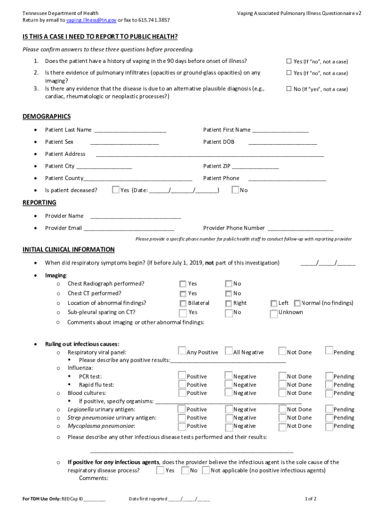 October 29, 2019, Updated Guidance for Evaluating and Caring for Patients with Suspected Cigarette, or Vaping, Product Use Associated Lung Injury Summary and Action Items CDC has released Update: