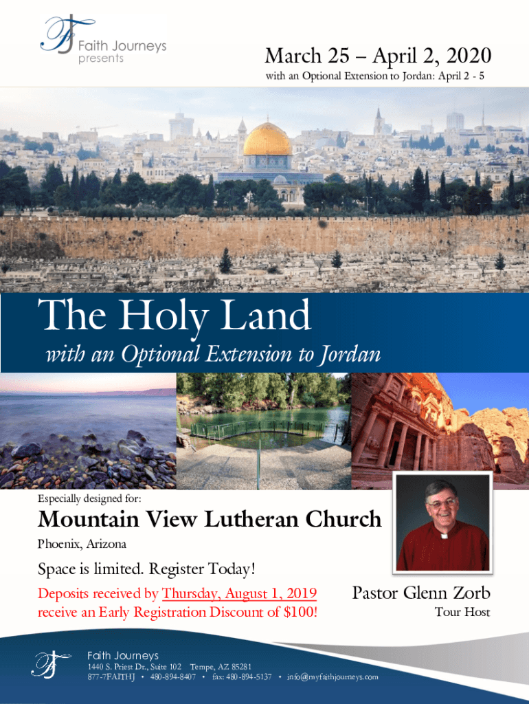 Presents March 25 April 2, 2020, with an Optional Extension to Jordan: April 2 5The Holy Land with an Optional Extension to Jordan Including an optional extension to JordanEspecially designed for:Mountain