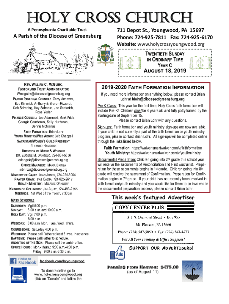 HOLY CROSS CHURCH A Pennsylvania Charitable Trust Parish of the Diocese of Greensburg711 Depot St., Young wood, PA 15697 Phone: 7249257811 Fax: 7249256170 Website: www.holycrossyoungwood.orgTWENTIETH