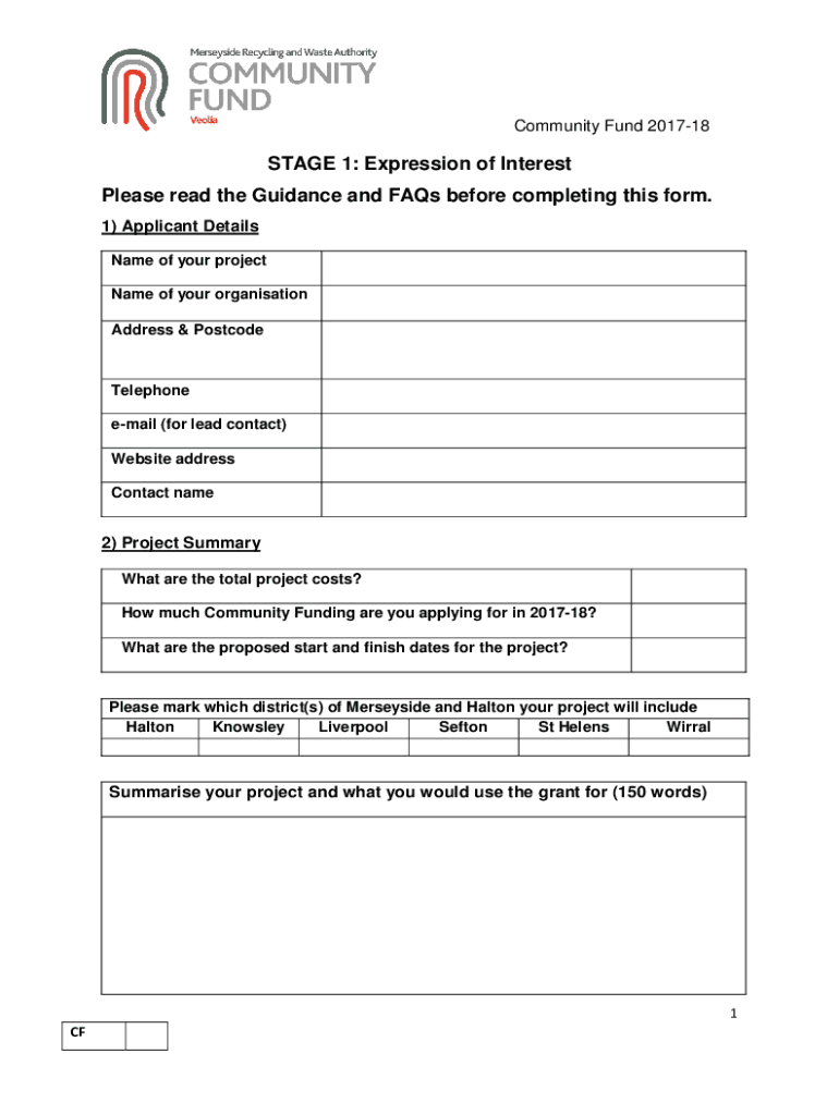 Community Fund 201718STAGE 1: Expression of Interest Please read the Guidance and FAQs before completing this form. 1) Applicant Details Name of your project Name of your organization Address & PostcodeTelephone