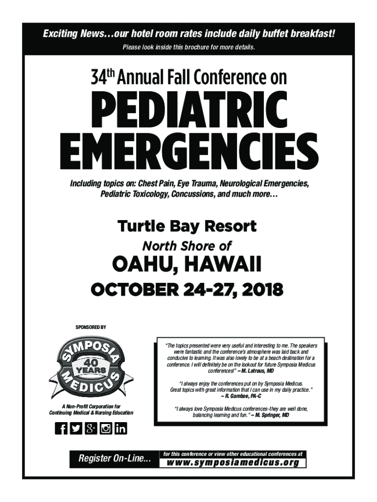 Exciting New sour hotel room rates include daily buffet breakfast! Please look inside this brochure for more details.34th Annual Fall Conference pediatric EMERGENCIES Including topics on: Chest Pain,
