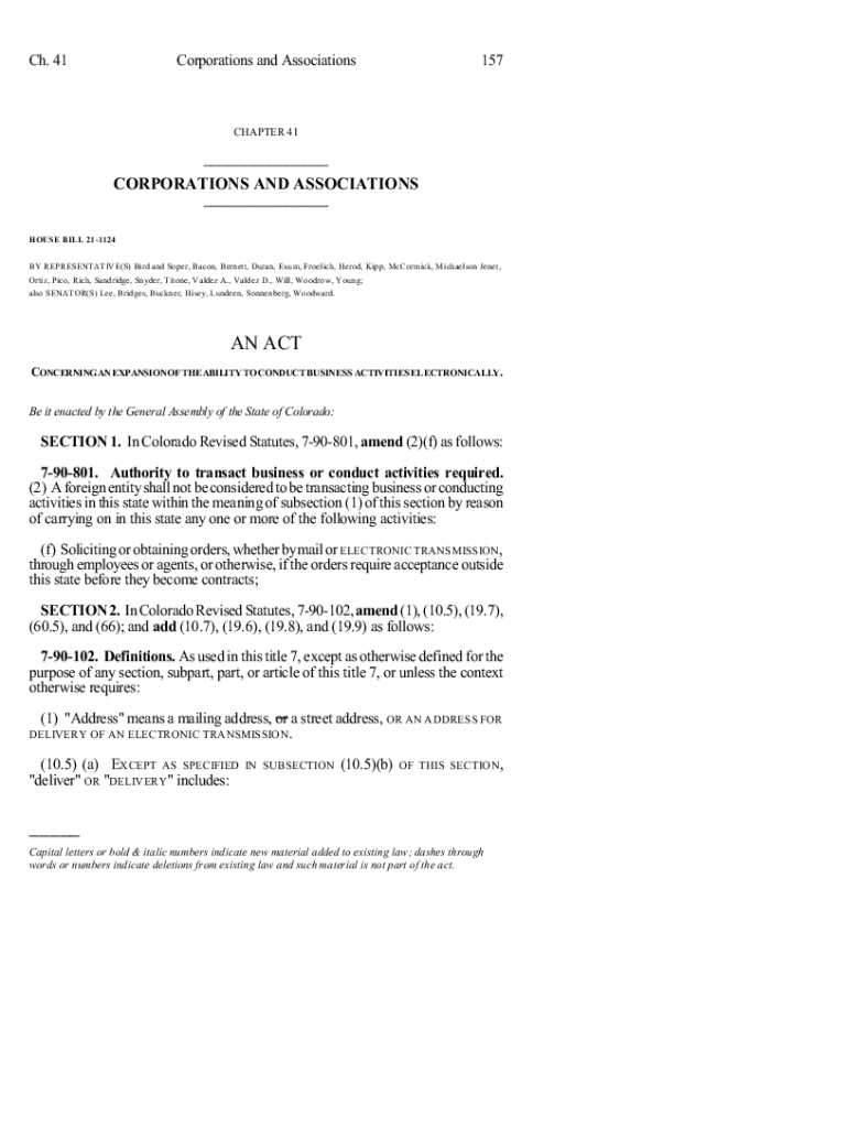 Ch. 41Corporations and Associations157CHAPTER 41___ CORPORATIONS AND ASSOCIATIONS ___ HOUSE BILL 211124 BY REPRESENTATIVE(S) Bird and Super, Bacon, Bennett, Duran, Exam, Frolic, Herod, IPP, McCormick,