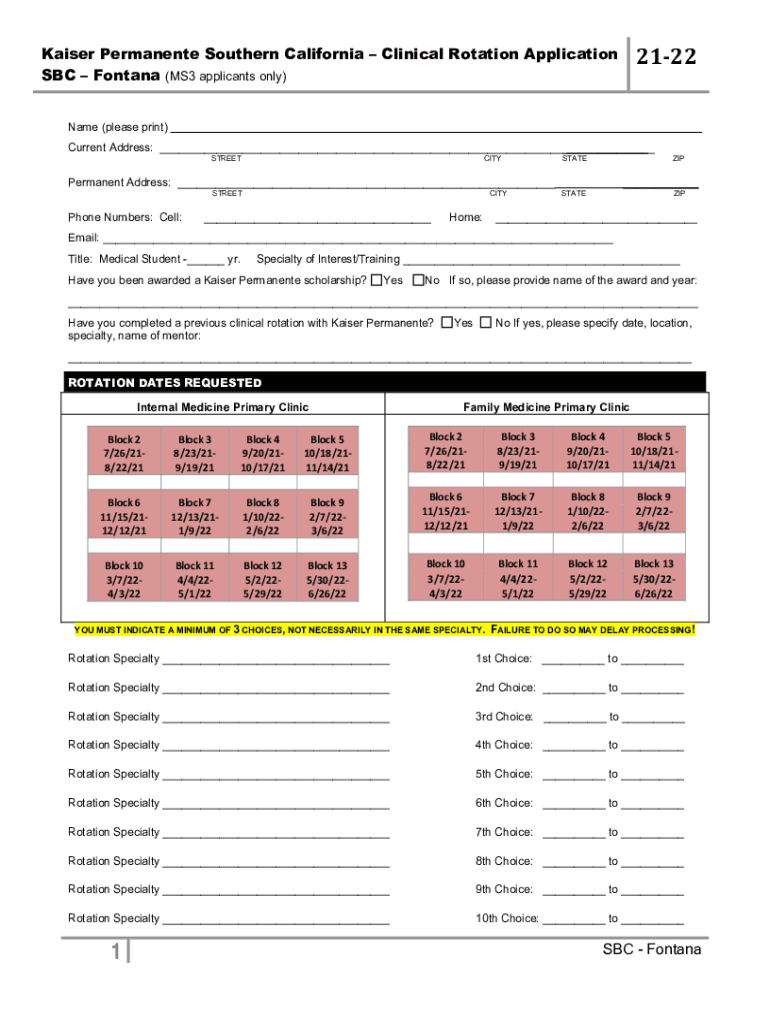 2122Kaiser Permanent Southern California Clinical Rotation Application SBC Fontana (MS3 applicants only) Name (please print)Current Address: ___ ___ STREETCITYPermanent Address: ___ Freephone Numbers: