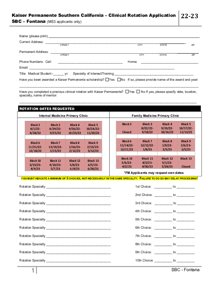 2223Kaiser Permanent Southern California Clinical Rotation Application SBC Fontana (MS3 applicants only) Name (please print)Current Address: ___ ___ STREETCITYPermanent Address: ___ Freephone Numbers: