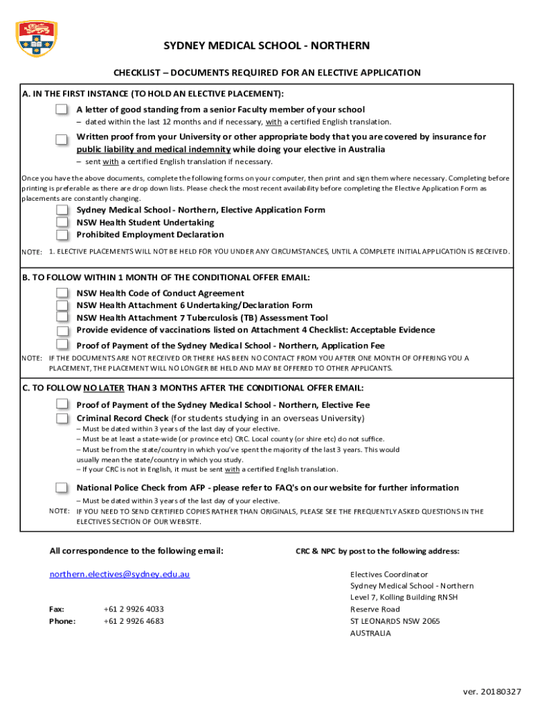 SYDNEY MEDICAL SCHOOL NORTHERN CHECKLIST DOCUMENTS REQUIRED FOR AN ELECTIVE APPLICATION A. IN THE FIRST INSTANCE (TO HOLD AN ELECTIVE PLACEMENT): A letter of good standing from a senior Faculty member