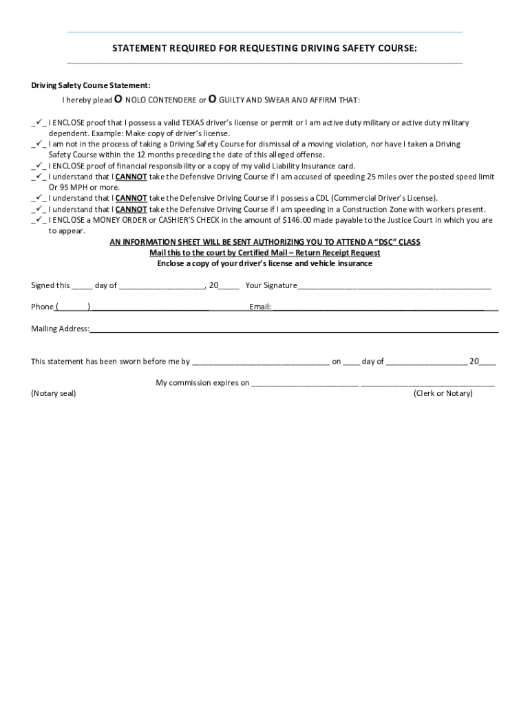 STATEMENT REQUIRED FOR REQUESTING DRIVING SAFETY COURSE: Driving Safety Course Statement:I hereby plead ON OLO CONTENDER or O GUILTY AND SWEAR AND AFFIRM THAT:__ I ENCLOSE proof that I possess a valid