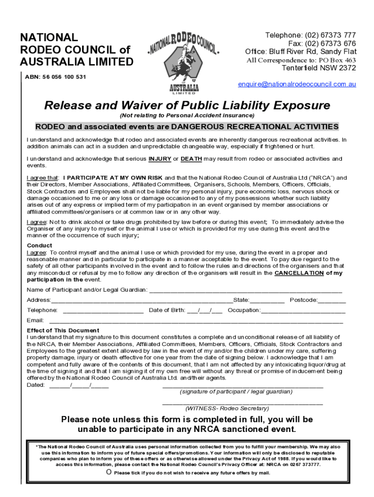 NATIONAL RODEO COUNCIL of AUSTRALIA LIMITEDTelephone: (02) 67373 777 Fax: (02) 67373 676 Office: Bluff River Rd, Sandy Flat All Correspondence to: PO Box 463 Chesterfield NSW 2372ABN: 56 056 100 531enquire×nationalrodeocouncil.com.release