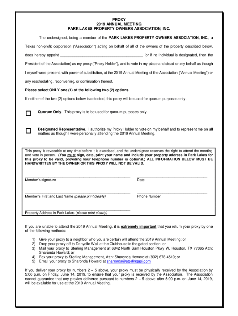 PROXY 2019 ANNUAL MEETING PARK LAKES PROPERTY OWNERS ASSOCIATION, INC. The undersigned, being a member of the PARK LAKES PROPERTY OWNERS ASSOCIATION, INC., a Texas nonprofit corporation (Association)